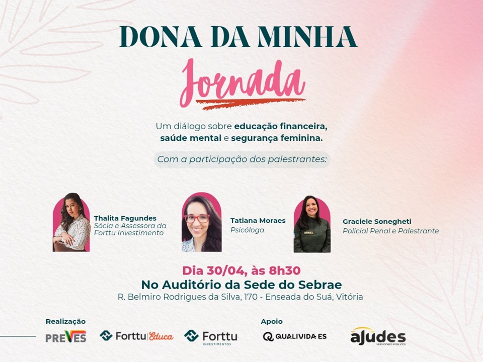 A PREVES – Fundação de Previdência Complementar do Espírito Santo promove no Auditório do Sebrae-ES, na Enseada do Suá, em Vitória, das 08h30 às 11h, o evento "Dona da Minha Jornada", uma iniciativa voltada para o público feminino, em parceria com a Forttu Investimentos e apoio do Programa Qualivida. O encontro tem como foco reunir mulheres servidoras públicas para uma manhã de diálogos vitais sobre temas que promovem a qualidade de vida e a autonomia feminina.