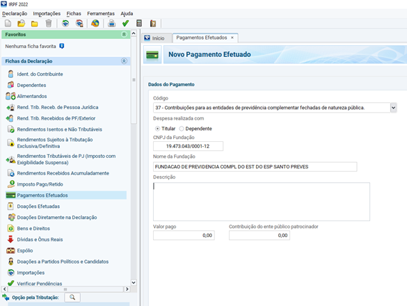 Ao acessar o programa de Declaração do IRPF 2025, busque a ficha “pagamentos efetuados” e escolha a opção 37 - Contribuições para as entidades de previdência complementar fechadas de natureza pública, conforme imagens abaixo: