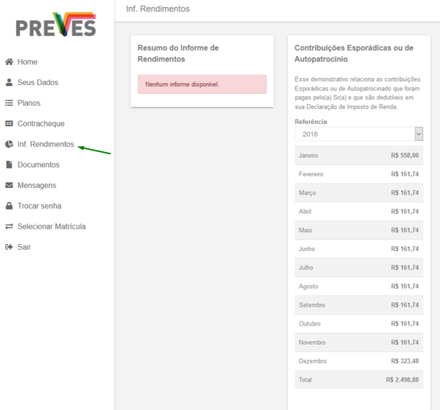 Se você é participante autopatrocinado, basta acessar a área restrita do site da PREVES a partir do dia 1º de março, para obter a informação de contribuições efetuadas, conforme as imagens abaixo: